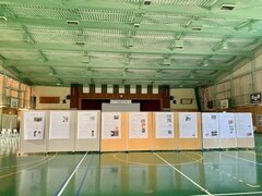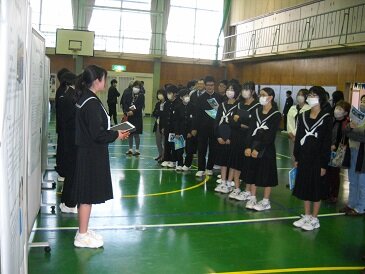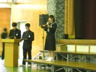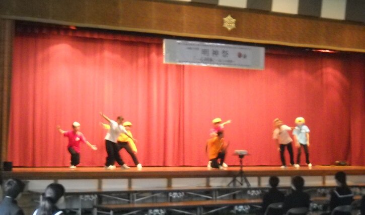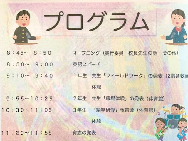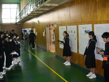 本校『明神祭』が、町内外からのご来賓、保護者の皆さん方をお招きして盛大に開催できました。実行委員の進行で、体育館での各種発表が展開していきます。さらに、教室棟での1年フィールドワーク発表、体育館フロアに戻っての2年職場体験報告と続きます。