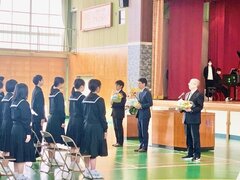 会の冒頭では、あらためて「離任者あいさつ」の場をもち、保護者の皆さん方からも花束の贈呈がありました。