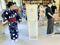 まずは、わが国古来からの、正しい立礼・座礼を学び、次に、班ごとに着付けを学んでいきます。きれいに着られると、皆、笑顔がほころび、「さまになった」姿にご満悦!