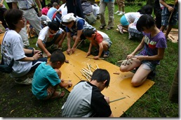 捕まえたアナゴの腹をかいた後、自分達で作った竹串に刺し、炭で焼いてみんなでいただきました。その後、グループ対抗で色々なネイチャーゲームを行いました。写真は、長い葉っぱや、ギザギザの葉っぱなど、お題に沿って集め勝負しているところです。