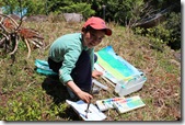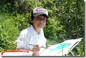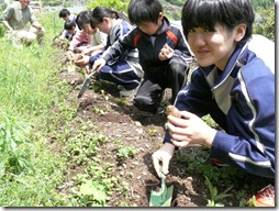 農園に着いていろいろな野菜を観察してみると、5月1日に植えたサトイモがかわいい芽を出していました。玉ねぎも大きくなってきて、試しに一本抜いてみると、5㎝ぐらいでした。後で切って食べてみると、なかなか甘くておいしかったです。あと2週間ほどすれば10㎝ぐらいの玉ねぎを収穫できるかな?村長のT子さんが、「玉ねぎはつるしておけば子ども村祭りまでもつから、そうしたいです。」と言っていました。ジャガイモは花が咲き始めたので、これももうすぐ収穫できそうです。