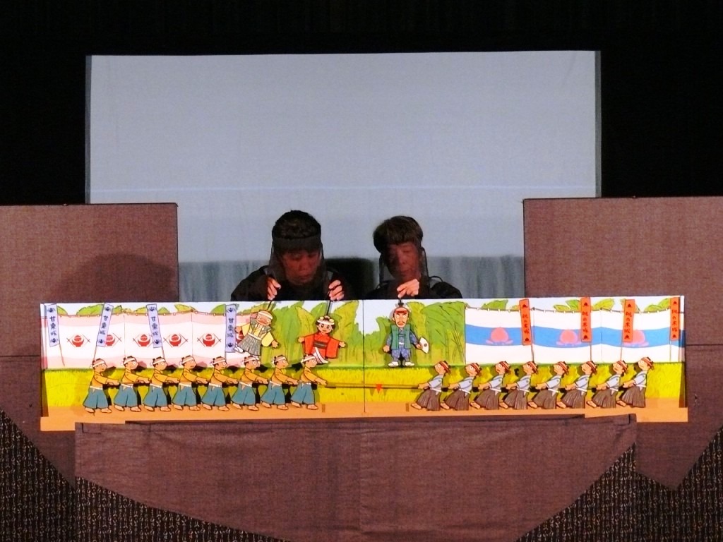 「一大事でござる!」は、お殿様が留守の間に隣国が攻めてきて、それをお姫様のきれいで純粋な心が救うというものでした。お城の中や外、綱引きのシーン、遠眼鏡で見える景色など、場面転換が多く、登場する人(人形)も多かったのですが、演じているのはたったの2人!演技力の高さにびっくりしました。