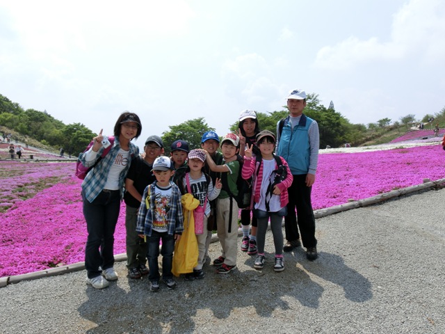午前中の目的地は、萩太郎山にある「天空の花回廊 芝桜の丘」。生活班で声を掛け合いながら坂道を上り、目的地を目指しました。頂上付近に到着すると、七分咲きの芝桜をバックに、記念写真を撮影しました。歩道を歩く他のお客さんに、元気よくあいさつする子どもや、自然に道を譲る子どもたちの姿が見られました。周りの状況を自分なりに判断し、行動できた子どもたちに感心しました。