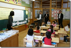 今回は、愛知県教育委員会義務教育課の先生をはじめとする18名の方々にお越しいただき、全8学級の授業のようすを実際に見ていただきました。子どもたちがお互いに率直に意見を交換し、深く考えている姿を評価していただくとともに、豊根小学校の研究を今後さらに工夫を加え、深めてほしいとの要望もいただきました。