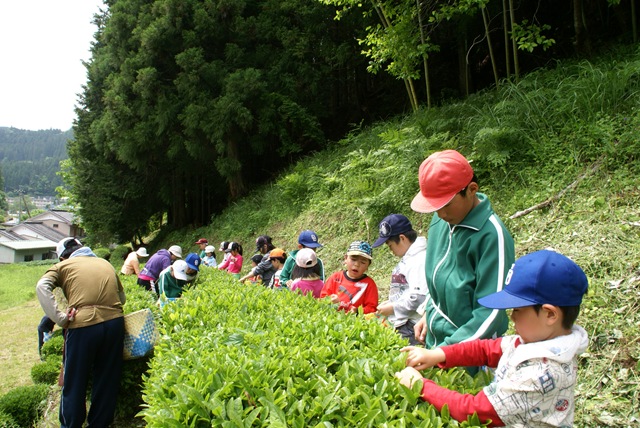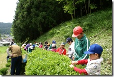 今年も地域の方から茶畑を提供していただき、みどりの少年団の活動として、5月31日に全校児童でお茶摘みを行うことができました。茶葉がやわらかく、とても摘みやすかったため、子どもたちが 進んで摘んだ結果、なんと85キロもの茶葉を摘むことができました。みんな大豊作に喜びながらも、みんなでがんばって摘んだことに満足していました。また、この日も多くの保護者の方も協力してくださいました。