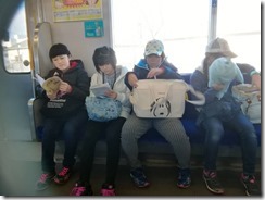 電車内では、ウノをしたり、会話をしたりして楽しんでいます。