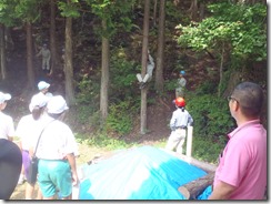 高校生による林業演習を見学しました。 林業科3年生の先輩方が、枝打ちや草刈機、チェーンソーによる実演をしてくれました。枝打ちを行う理由や、作業を行うときに必要な道具の説明なども聞くことができました。