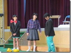 2年生劇は,名探偵コナンやドラえもんが事件に巻き込まれ,おもしろおかしく事件を解決していく内容でした。アニメキャラクターに扮した2年生が舞台せましと演技をしました。