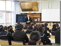 調理実習後は豊根村役場地域振興課長さんを講師に豊根村のチョウザメ養殖の取組について学びました。豊根村の取り組みを知った生徒たちは、「豊根村の環境がチョウザメの飼育に適していることが分かりました。」「チョウザメからキャビアがとれるまで9年以上もかかるなんて驚きました。」「2020年に向けてキャビアの商品化を頑張ってほしいと思います。」などと感想を述べていました。