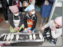 お米をこねるところでは、だんだんとすりこぎにお米が張り付いてきて大変そうでしたが、すりこぎをひねりながら上手にこねていました。串にもちをつけるところでは、きれいな楕円の形になるように一生懸命やっていました。最後に焼くところでは、五平餅のたれのおいしそうな香りをかぎながら、ていねいに焼いていました。