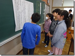 | 6年生は4人で、担任と合わせて5人なので、毎日5人で給食当番をやっています。アレルギーの関係もあるので、誰が何を持ってくるか、何を準備するかは、その都度自分たちで決めて動いているので、6年生の給食当番表はありません。 |
