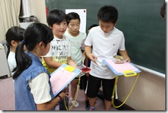 全校児童が縦割りで12班に分かれ、各教室を回りながら食べ物に関する12個のクイズを解いていきました。栄養委員会の子どもたちは事前に図書室で調べた内容をクイズにしてあり、なかなか難しい問題もありました。各教室には画用紙のクイズとスタンプが用意されており、各班ごとに楽しそうに教室を回っていました。答え合わせでは8問正解が最高でしたが、スタンプラリーをする中で食べ物に関する様々な知識を身につけ、関心を高めていきました。