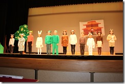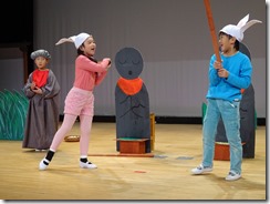 2年生は、「おばけじぞう」という劇でした。いたずらきつねが地蔵に化けて兎の子どもを困らせる場面や、兎が作戦を立ててきつねを捕まえる場面がとてもおもしろく、会場から笑い声が絶えませんでした。3人が一生懸命演じている姿が印象的でした。