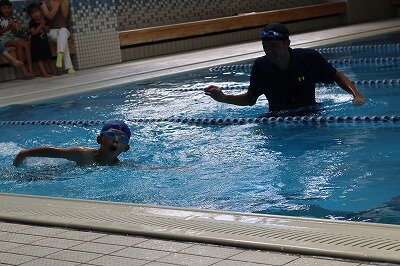 1~4年は5分間距離泳、3~6年は25m自由形、5・6年はさらに25m平泳ぎを行いました。