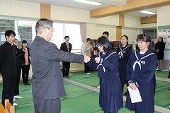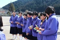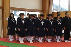 津具中学校の1年が終わりました。修了式が行われ、1,2学年の代表に修了証が渡されました。今回の校長の歌(本当は式辞です)は「どこかで春が」でした。21日には雪が舞った津具の里ですが、少しずつ春が近づいています。エネルギーをためた木の芽やつぼみがもうすぐ開く時を迎えます。生徒会長の3学期の総括も立派な話でした。いよいよ、進級の準備をする春休みです。