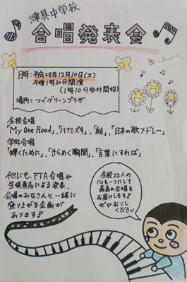 先週も合唱発表会に向けてがんばる姿が見られました。11月21日(月)からPTA合唱の練習がはじまりました。職員合唱の練習もはじまりました。11月25日(金)には、夏目はる子先生に各学年の合唱の指導をしていただきました。ありがとうございました。教えていただいたことを意識して、当日の発表に向けてがんばっていきたいと思います。