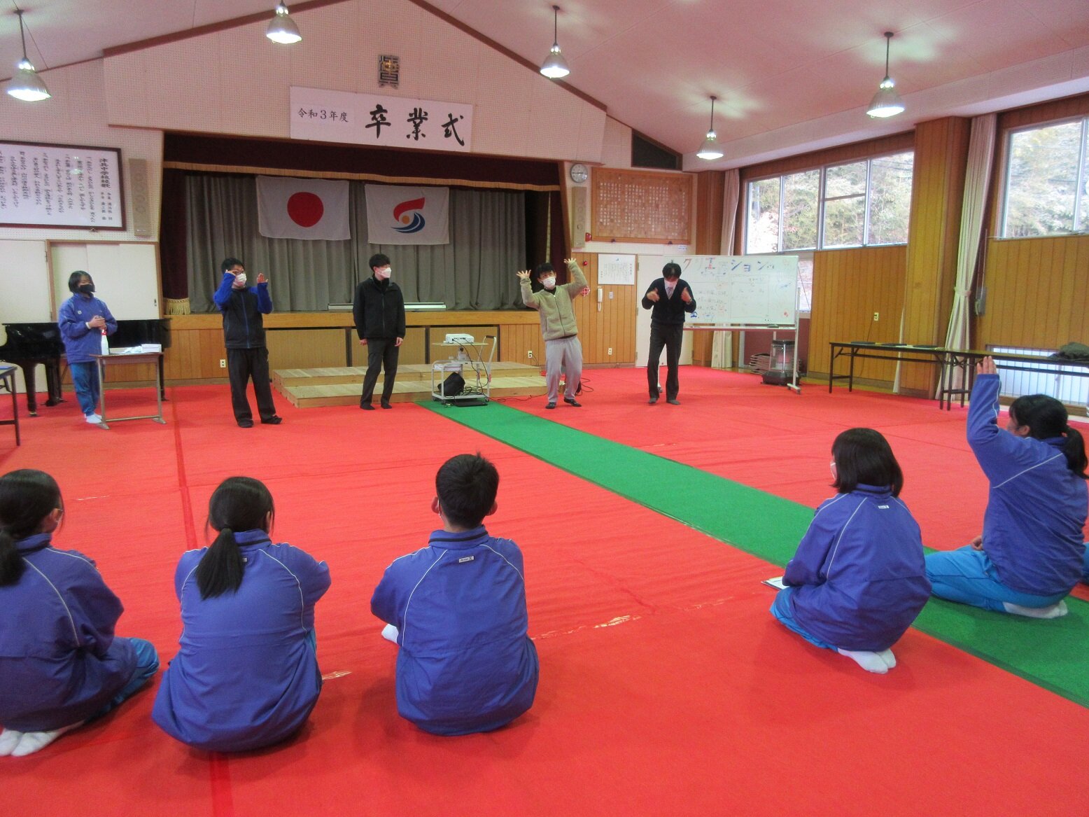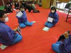 最初はレクリエーションで楽しみました。1回戦はジェスチャーゲーム、正解すると1ポイントです。2回戦は意思疎通ゲーム、お題から連想するものがチーム内で揃うと1ポイントです。生徒縦割り班3チームと先生チームの計4チームの団体戦です。