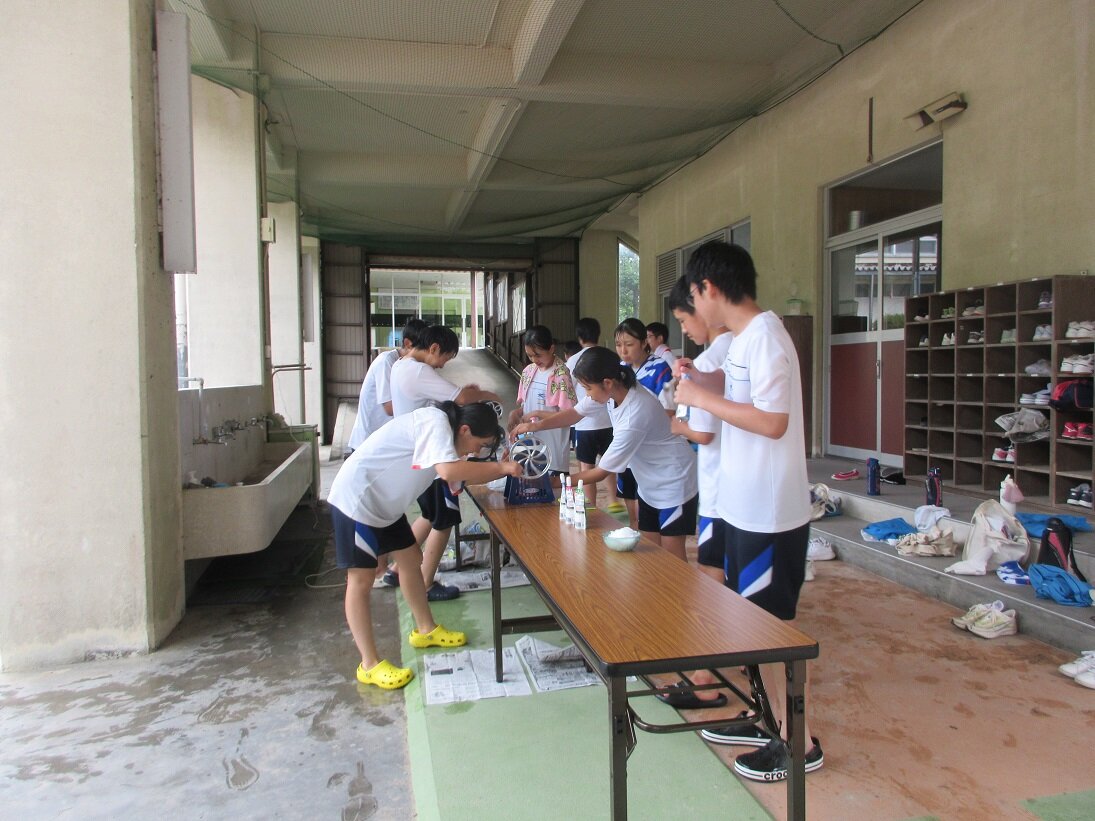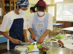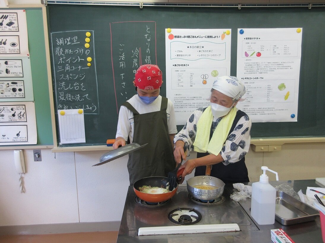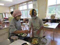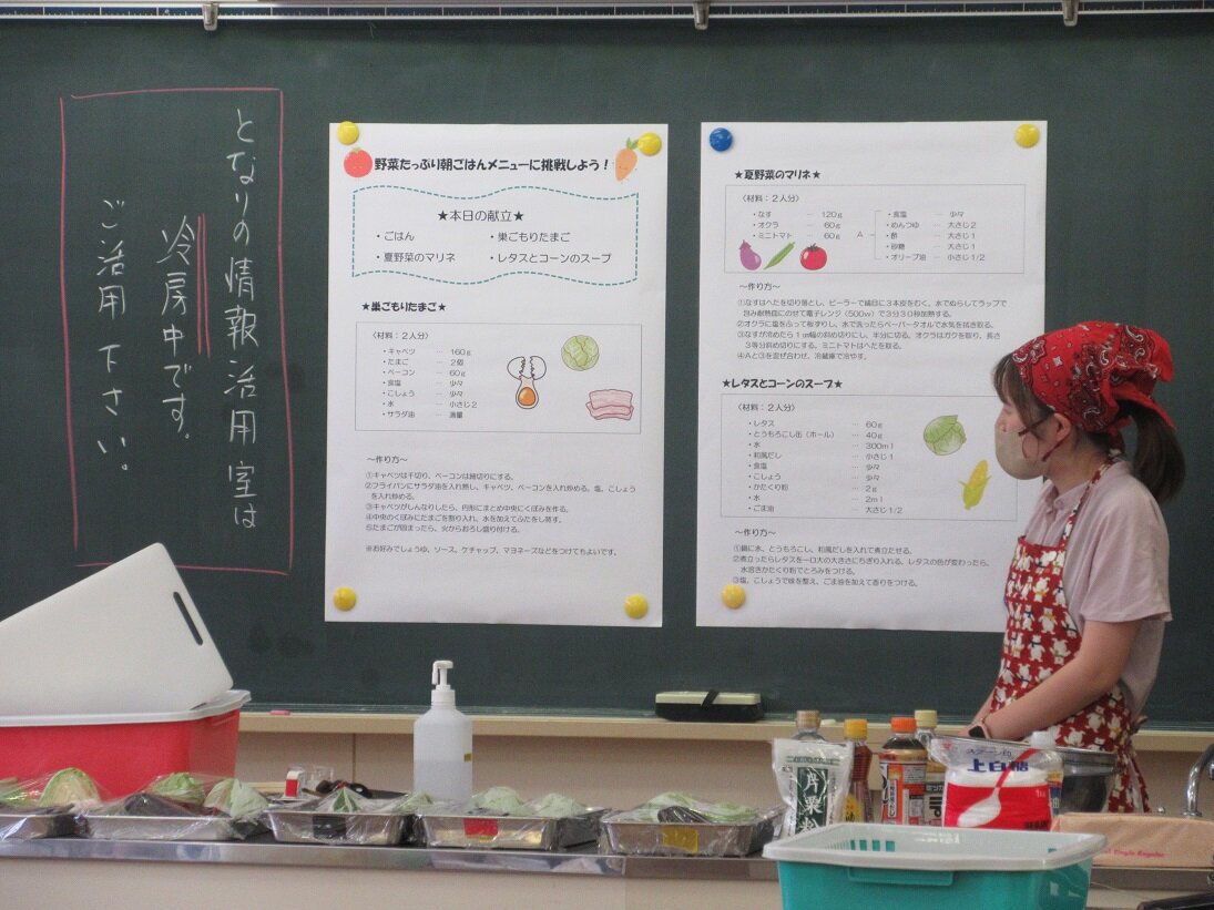 今年のテーマは、野菜たっぷりメニューです。最初に講師の小学校栄養教諭田島先生から調理方法の説明を受けた後、巣ごもりたまご、夏野菜のマリネ、レタスとコーンのスープの三品を作りました。どの家庭も手際よく、予定の時間より早くつくり終えることができました。